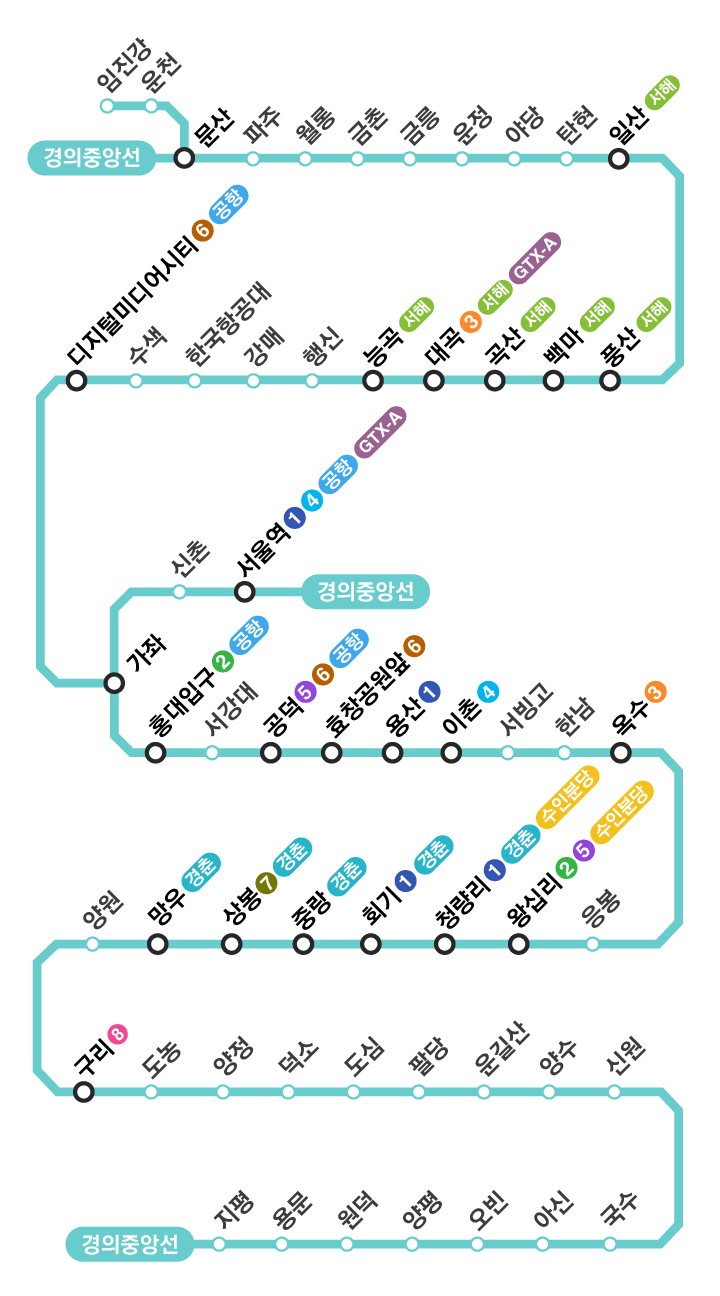 - 경의선(문산용산)과 중앙선(용산용문)을 통합한 형태로 구성되어 있습니다.
