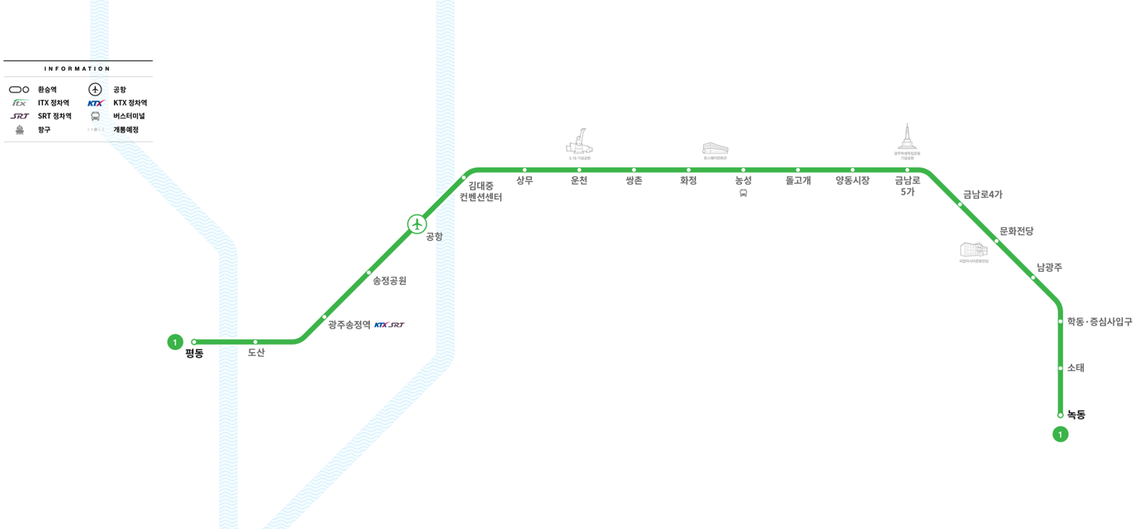 - 현재 광주 도시철도는 1호선 단일 노선으로 운행되고 있지만, 송정역에서는 KTX와 직접 연결되어 있어 타 지역으로의 장거리 이동 시 매우 유리한 환승 지점입니다.