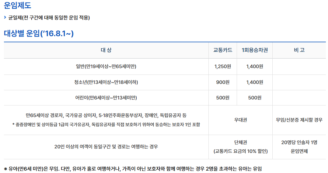 - 어린이 (만 6세 이상 ~ 12세 이하) : 교통카드 및 현금 모두: 500원