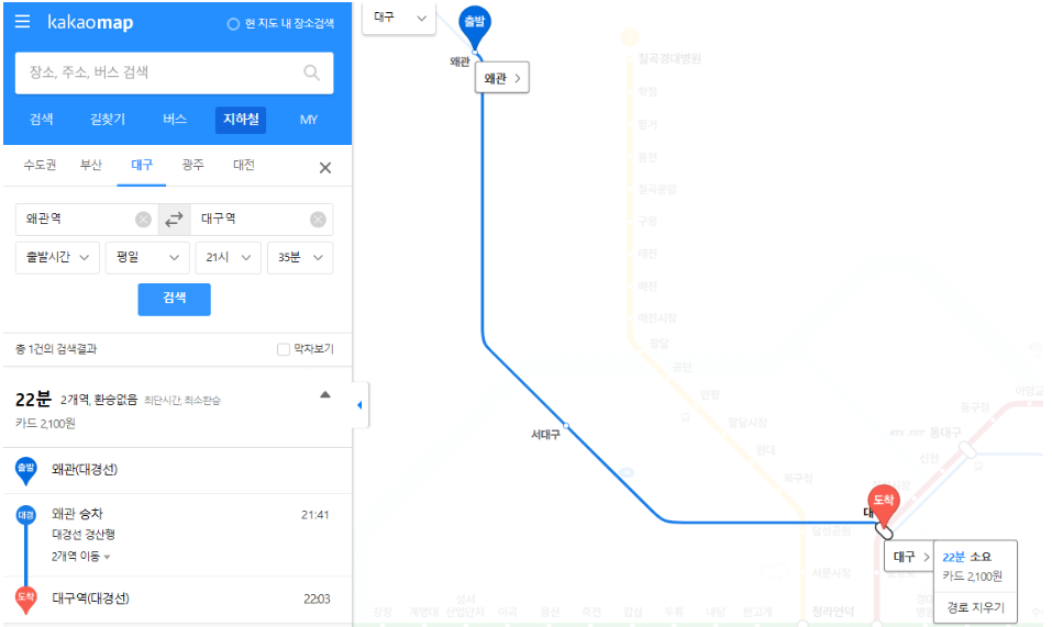 대경선의 기본 요금은 1,500원이며, 이동 거리가 10km를 넘을 경우 5km마다 100원이 추가됩니다. 예를 들어 구미에서 경산까지 전 구간을 이용할 경우, 약 2,800원 정도의 요금이 발생합니다.