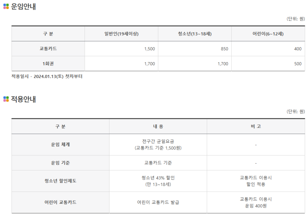 - 청소년(만 13세~18세): 교통카드 기준 1,200원