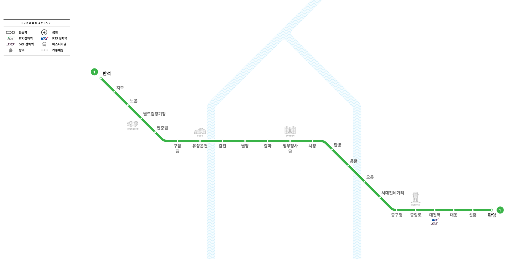 📌 대전 지하철은 현재 1호선 단일 노선으로 운행되며, 도시의 동서 구간을 연결하는 핵심 교통수단으로 자리 잡고 있습니다.
