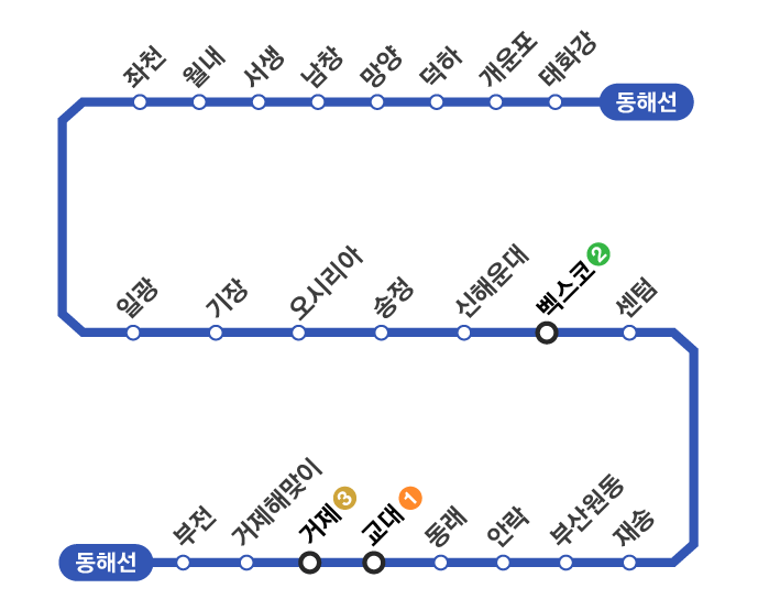 부전역과 태화강역은 KTX와 환승이 가능한 종착역이며, 그 외에도 거제역에서는 부산 지하철 3호선, 교대역에서는 1호선, 벡스코역에서는 2호선과 환승이 가능해 이동이 매우 편리합니다.