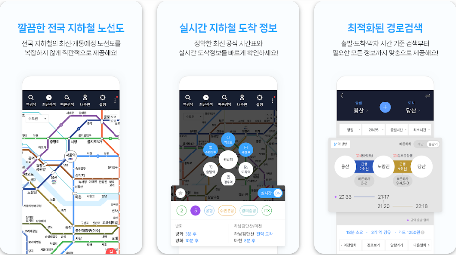 - 네이버 지도 & 카카오맵: 실시간 열차 도착 정보, 최적 경로, 막차 시간 등을 빠르게 제공