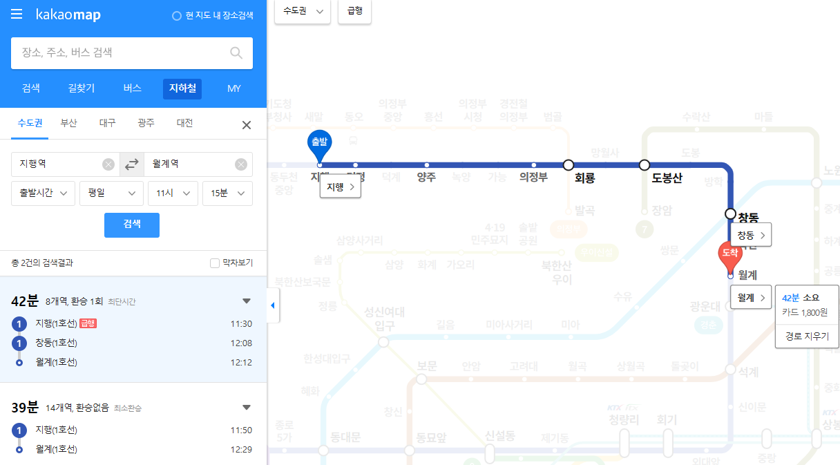 2️⃣ 원하는 구간의 출발역과 도착역을 입력합니다.