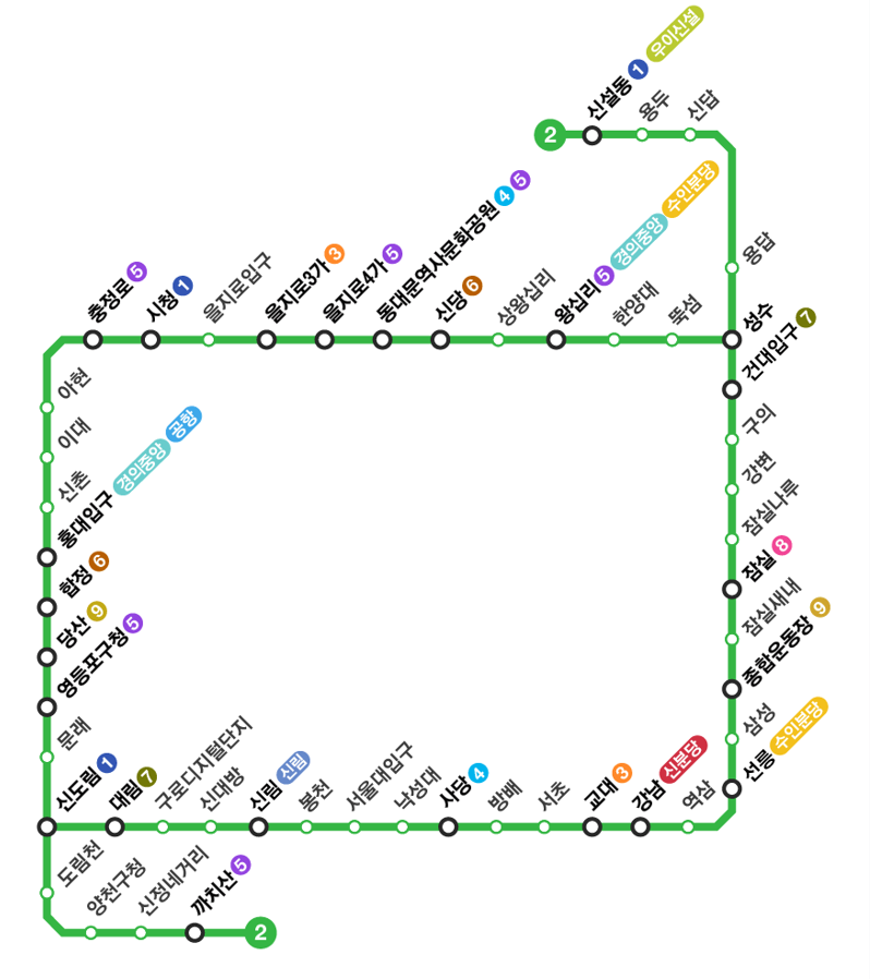 ✅️ 서울 지하철 2호선은 서울 전역을 순환하며 강남, 홍대, 신촌, 잠실, 건대입구 등 주요 상권과 주거지를 연결하는 대표적인 노선입니다.