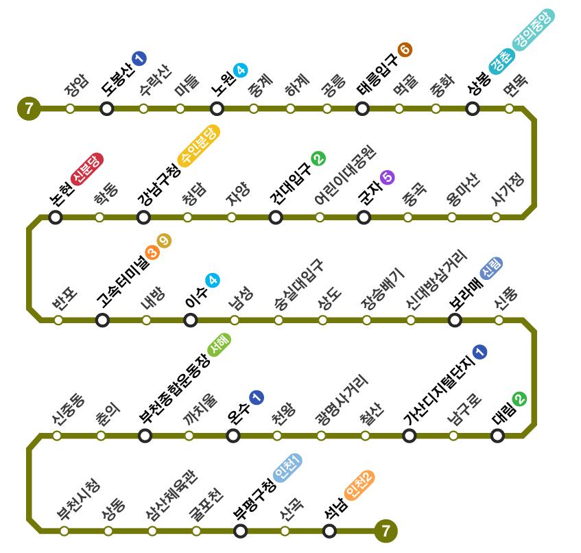 📌 서울 지하철 7호선은 인천 석남역부터 경기 장암역까지 이어지는 수도권의 중요한 동서축 노선으로, 서울과 인접 지역을 효율적으로 연결해주는 역할을 하고 있습니다.
