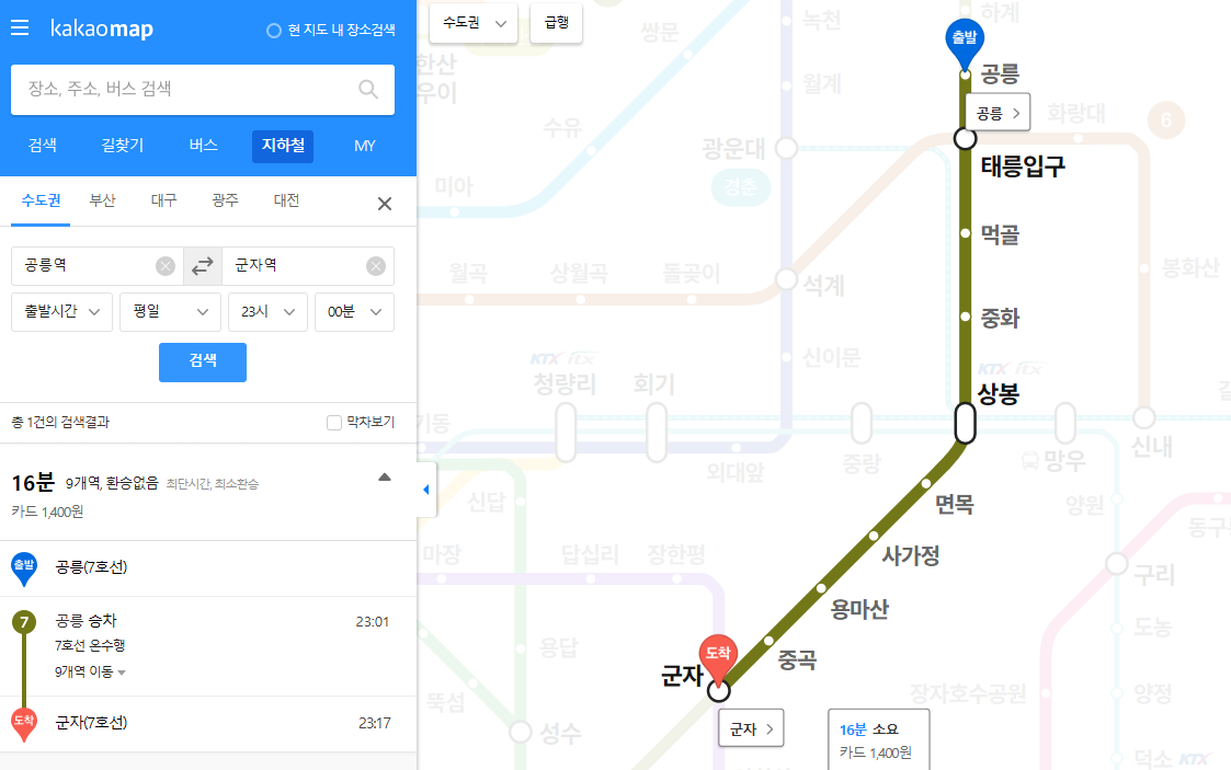 2️⃣ 조회 화면에서 7호선을 선택한 후, 출발역과 도착역을 입력합니다.
