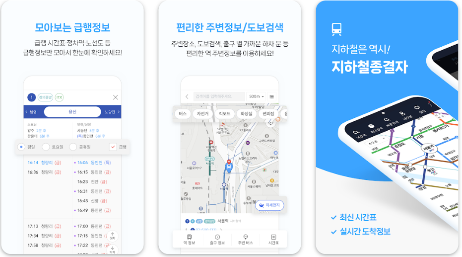 - 지하철종결자, 카카오맵 등 교통 관련 앱을 활용하면 도착 예정 시간, 배차 간격, 열차 위치, 혼잡도까지 실시간으로 확인할 수 있어 매우 유용합니다. 출구별 길찾기와 최적 환승 경로까지 안내해주기 때문에 목적지까지 훨씬 빠르고 편리하게 이동할 수 있습니다.