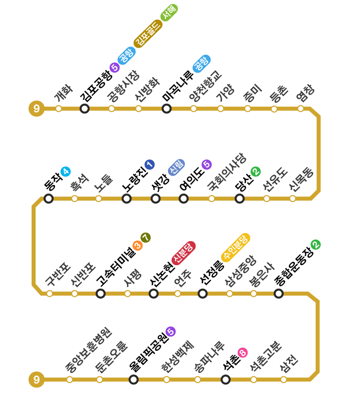 ✅️ 서울 지하철 9호선은 개화역에서 중앙보훈병원역까지 이어지며, 강서구를 출발해 여의도, 강남, 송파구 등 서울 주요 지역을 연결하는 빠르고 효율적인 노선입니다.