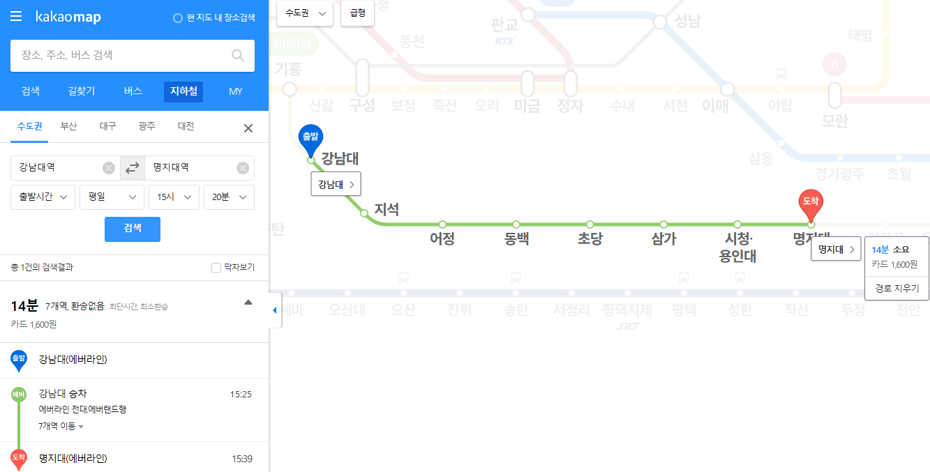 - 기본 요금: 1,600원 (교통카드 기준) / 1회용 승차권 1,700원 / 전체구간 이동시 1,800원