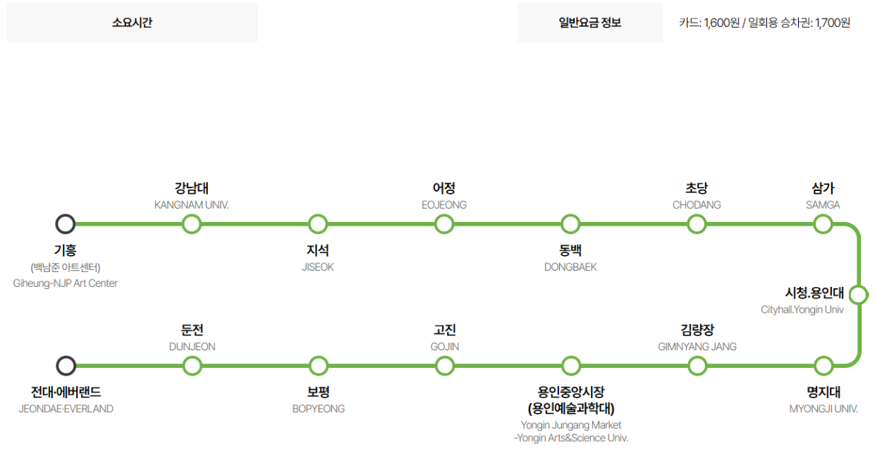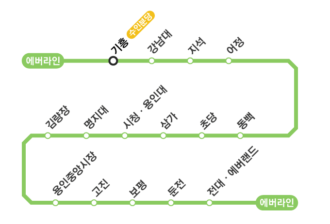 수도권 광역철도 분당선(기흥역)과 환승이 가능해 서울로 이동하기에도 편리한 교통수단이기 때문에 미리 노선도를 확인하시면 더욱 유용하게 활용하실 수있습니다.